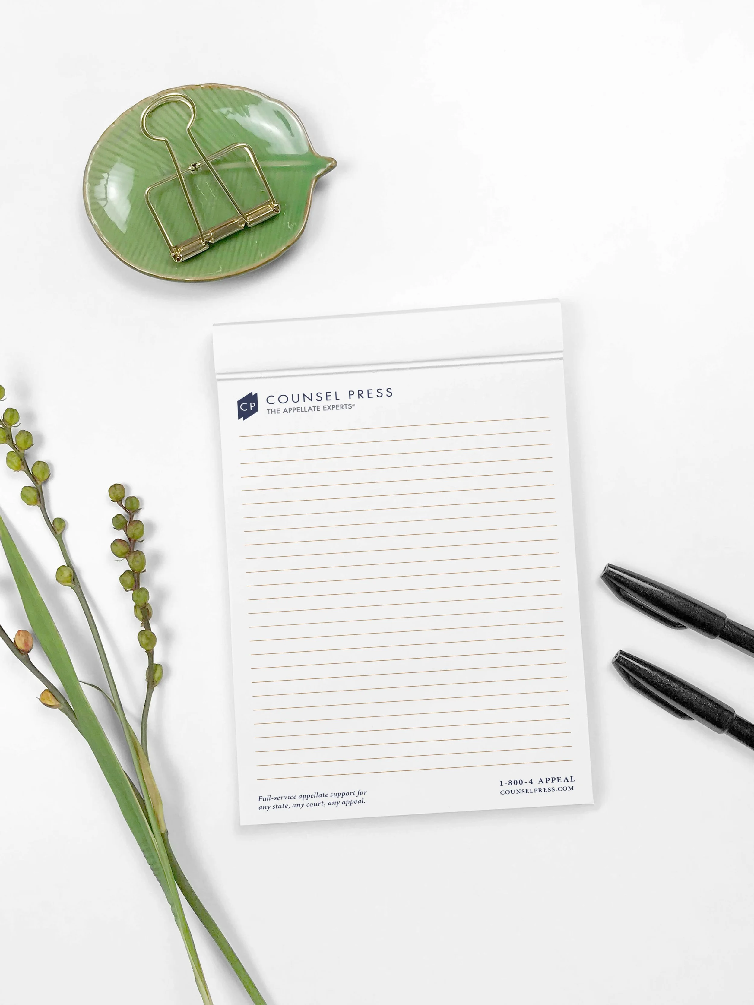 Inspired by Counsel Press’s state-of-the-art printing facilities at its NYC headquarters, I collaborated with the print production team to begin manufacturing small branded notepads to serve as marketing giveaways.
