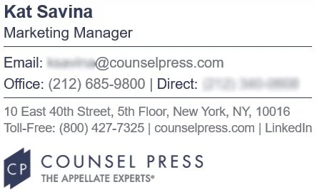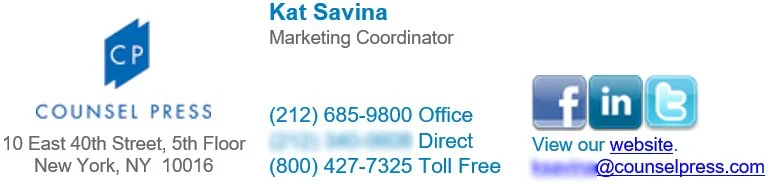 Leveraging my HTML/CSS coding and technology management skills, I designed a new layout for Counsel Press’s companywide email signature blocks.