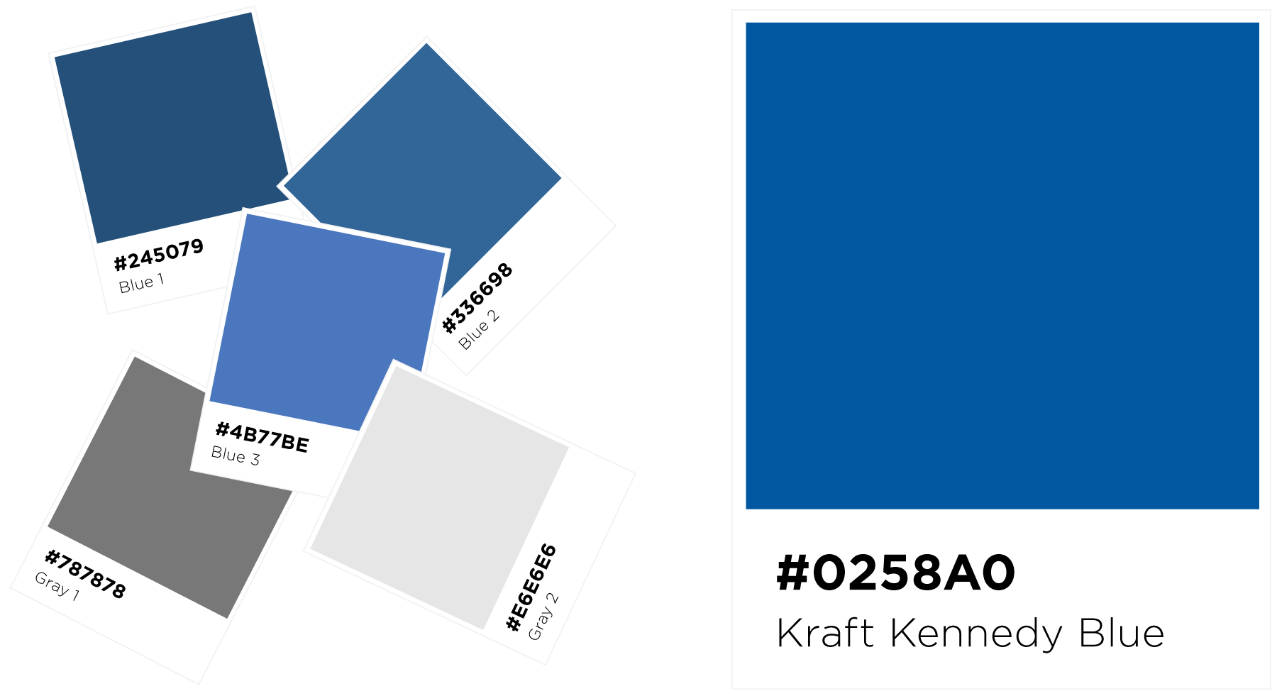 In 2017, I standardized the primary color selection to one Kraft Kennedy Blue, mainly often paired with simple white, and the grays remained as optional secondary highlight colors.
